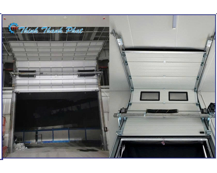 Kiểu trượt tiêu chuẩn (Standard Lift) là phương án phổ biến nhất, khi mở cửa sẽ trượt lên một đoạn ngắn rồi bẻ cong một góc 90 độ để nằm ngang song song với mặt sàn. Kiểu trượt nâng cao (High Lift) cho phép cửa đi thẳng dọc theo vách tường lên trên một khoảng cao rồi mới bẻ cong ngang sát trần, giúp giải phóng khoảng không phía trên cho xe nâng di chuyển hoặc lắp đặt đèn chiếu sáng.